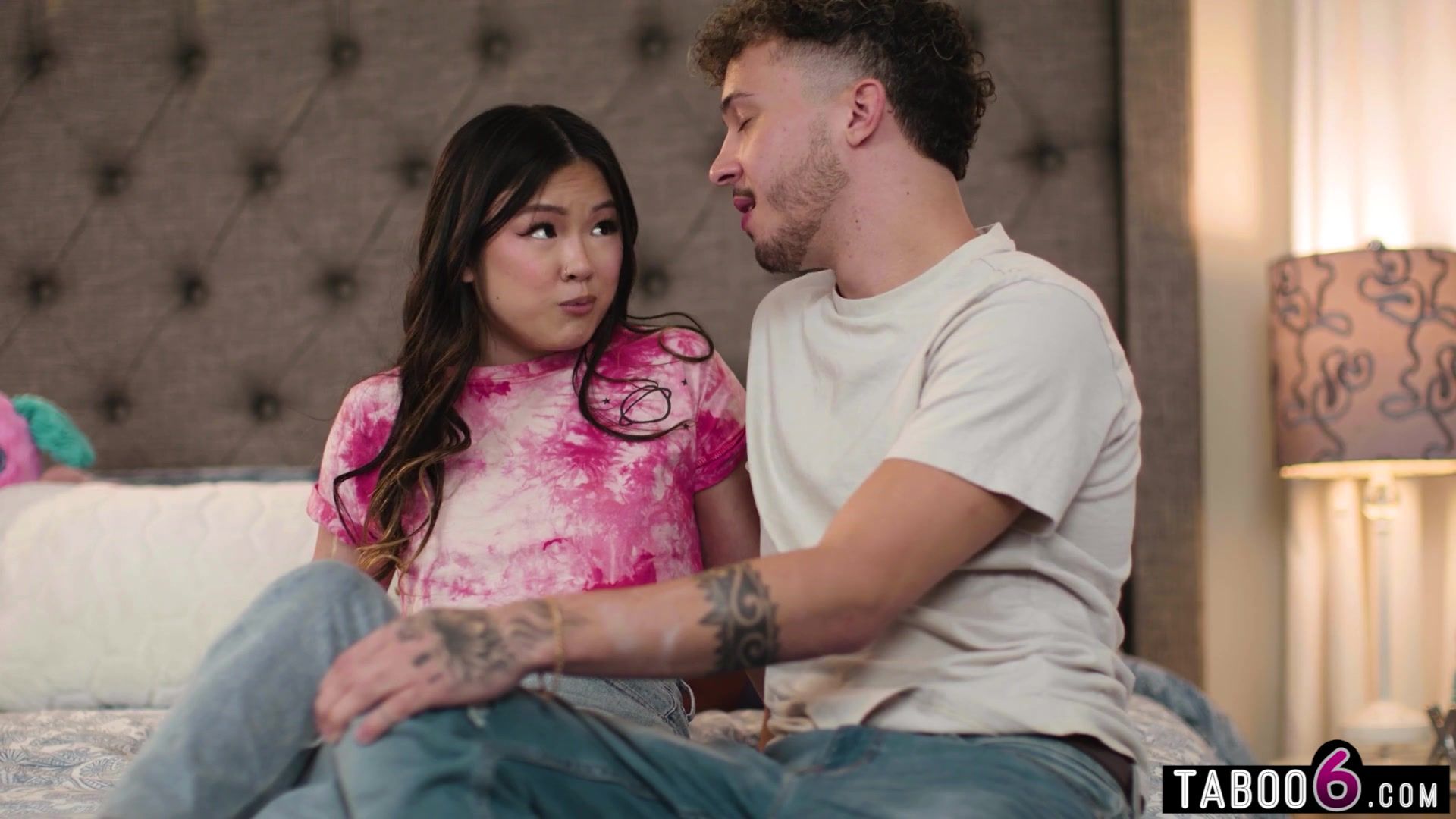 Tiny Asian teen Luly Chu sneaky sex with her huge cock white boyfriend when her stepdad thinks she is just studying upstairs! Studying his big dick is what she was really doing! He licked her hairy pussy before fucking it deeply!