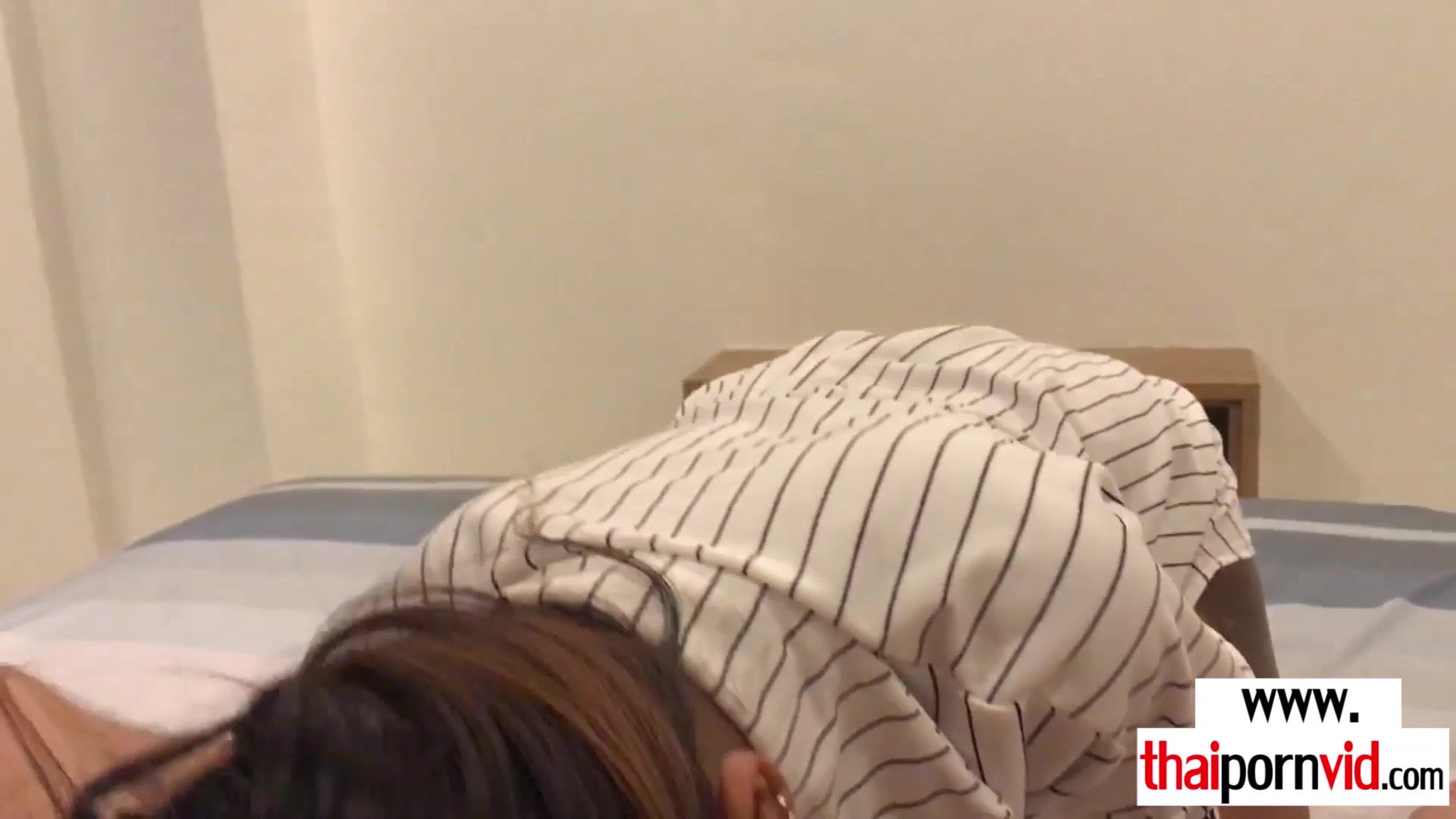Cute faced amateur Thai teen Cherry with small tits chooses a unique way to wake up her european lover The skinny asian slut takes his big white cock and she is stroking it and licking his balls then she is giving him an exotic blowjob