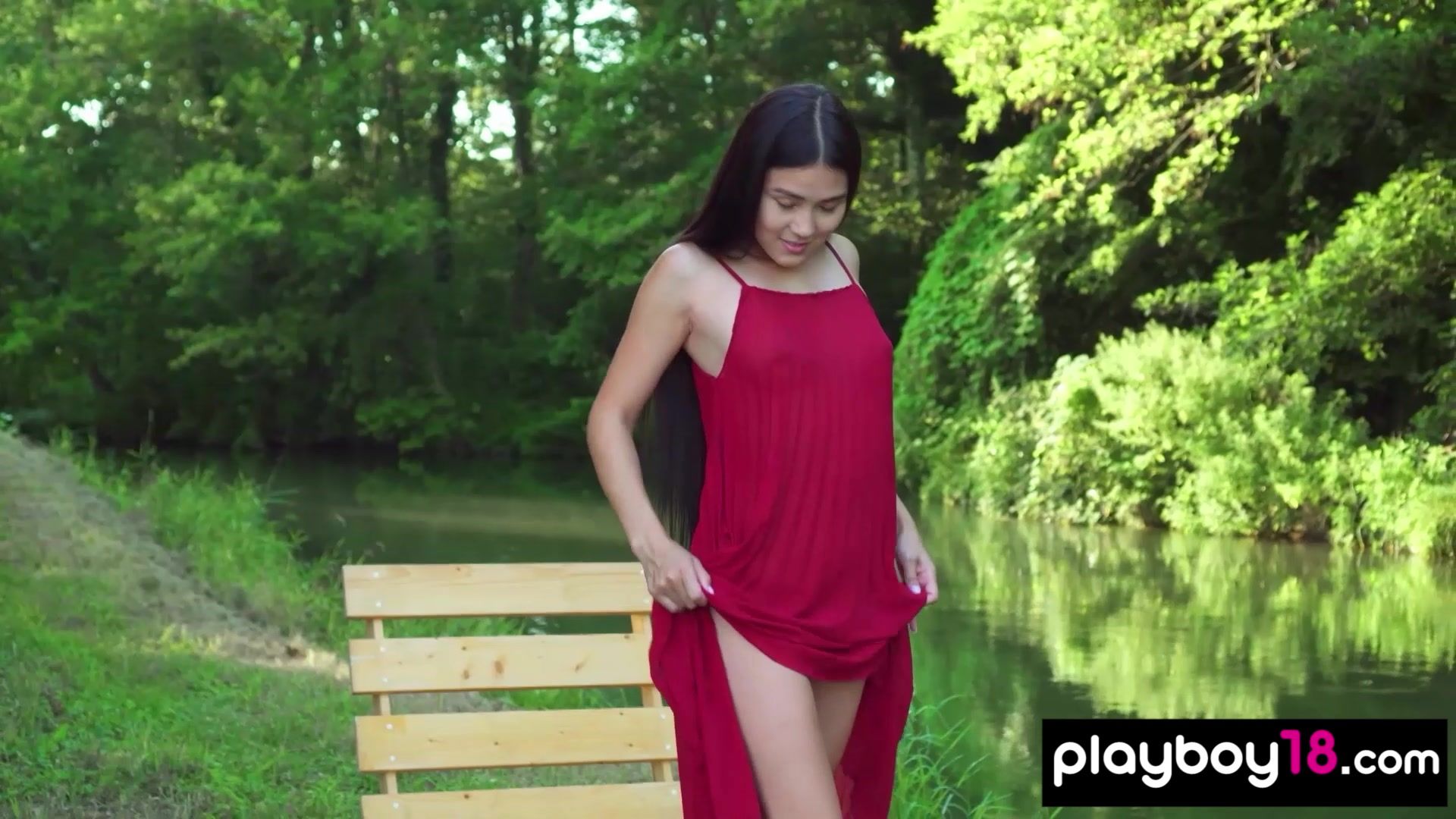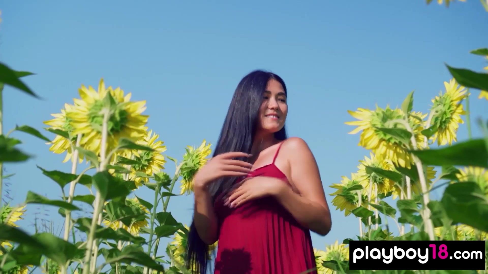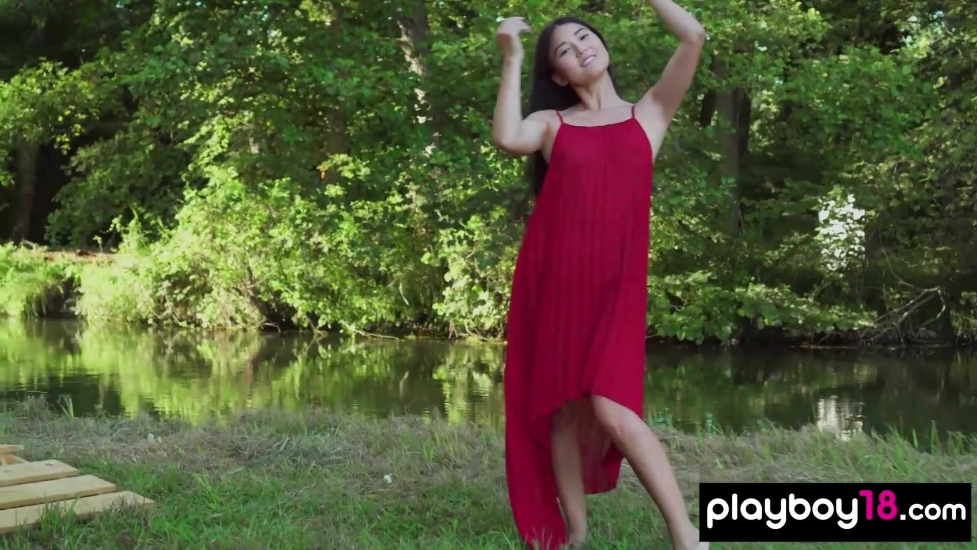 Cute faced asian muse Kimiko with perfect natural boobs in red dress is walking on a flowery field then she stops by a river and starts stripping to show her exotic shaved pussy and her bombastic shapes for Playboy
