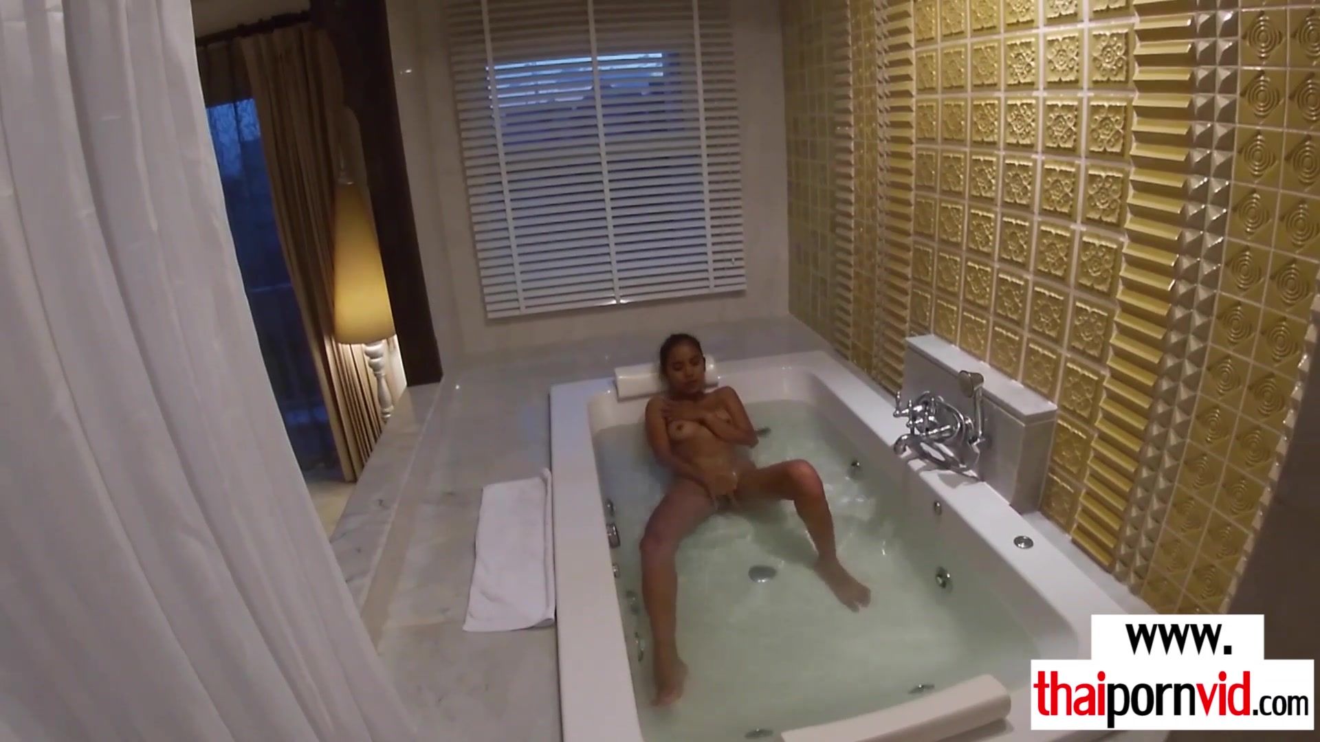 Petite amateur Thai teen Cherry with small tits is waiting her european lover and caressing her asian pussy in the bath when he arrives she takes his big white dick and starts sucking it After it she hops onto his to feed her hungry hole