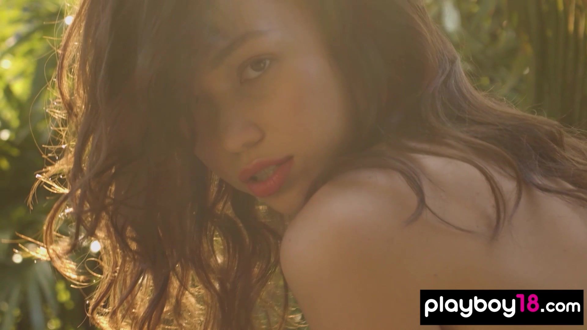 Hot brunette Filipina beauty with perfect natural tits named Kit Rysha is walking in the garden in diapered dress She stops by a palm tree and looks seductively into the camera then she starts stripping outdoor to show her amazing body for Playboy