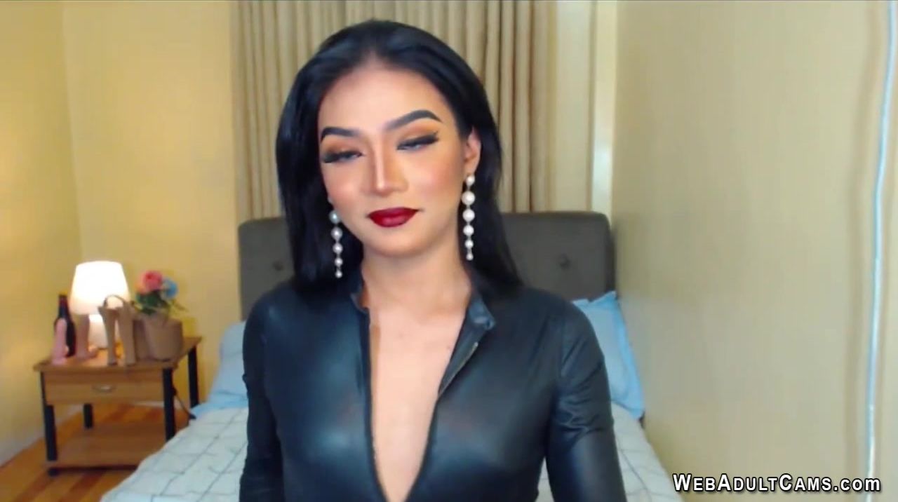 Dark haired amateur Asian trans ChloeSkinnyTS in black letaher body lingerie and black stockings strips off and jerks cock on solo private webcam show in bedroom