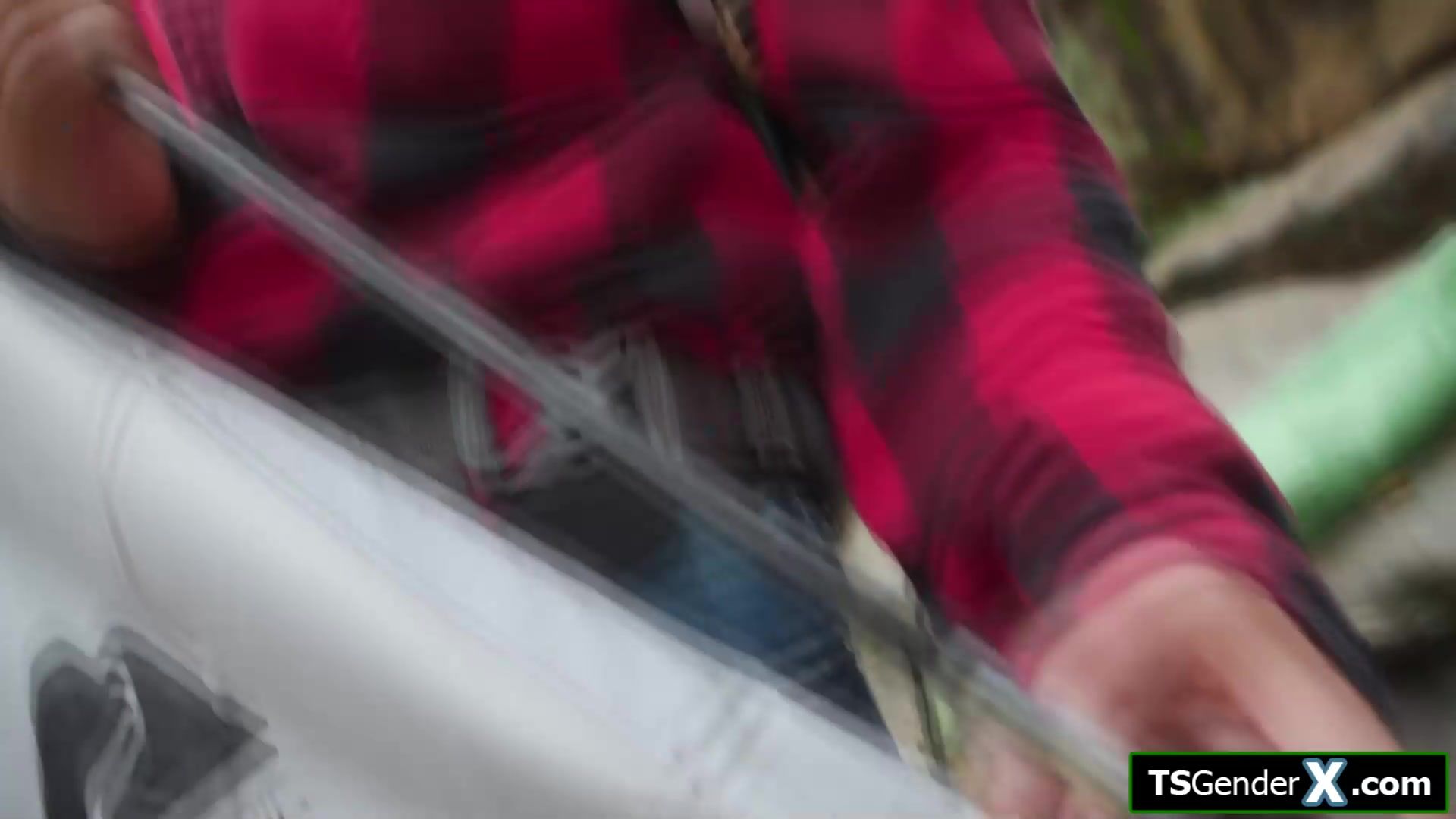 Asian tgirl Ember Fiera sucked and anal barebacked in a tent