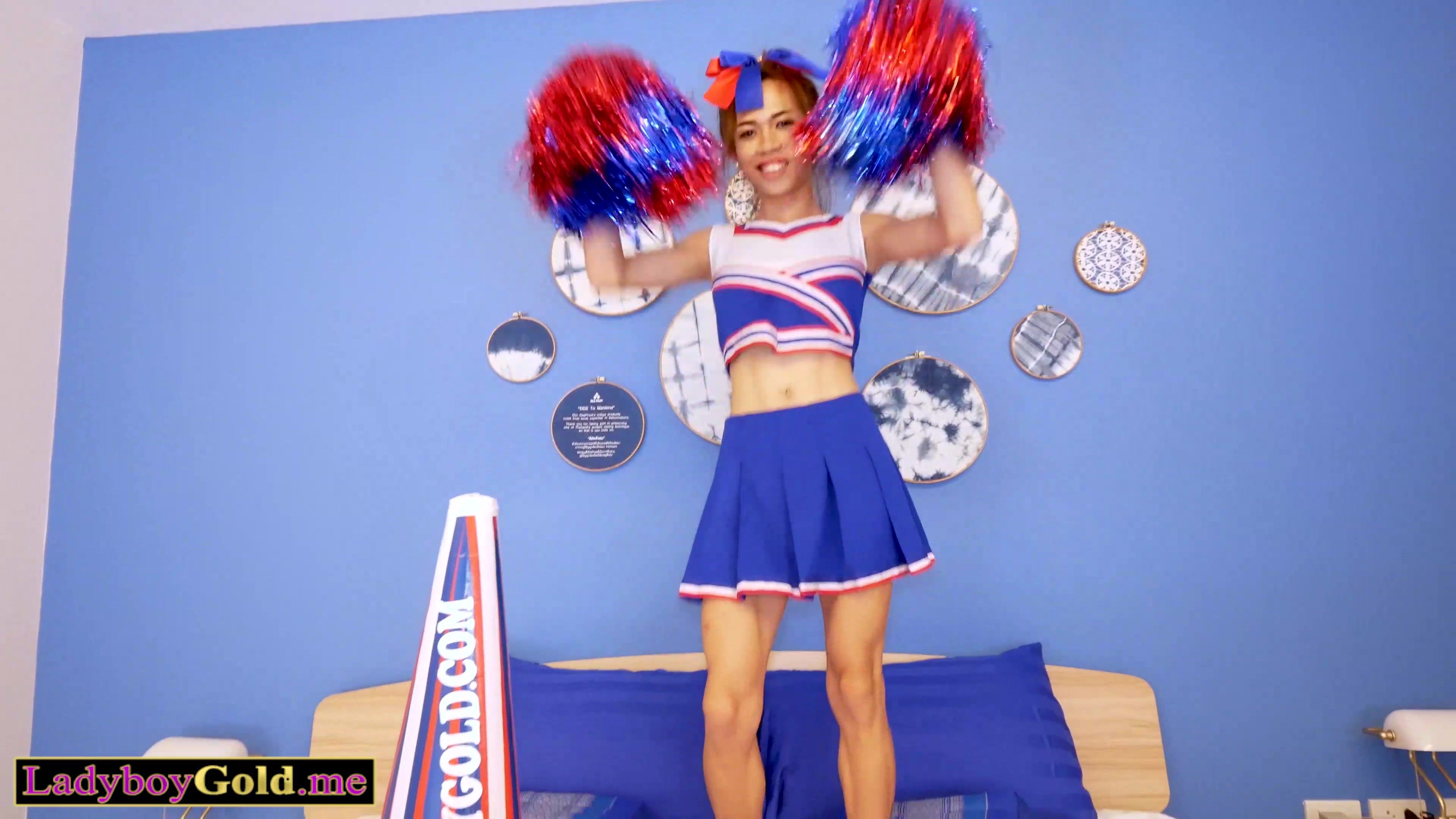 Petite amateur Thai ladyboy teen Lee with big boobs is shaking her bubble butt in her sexy cheerleader uniform without panties After her erotic dance she gets on her knees and starts serving her lovers big white cock