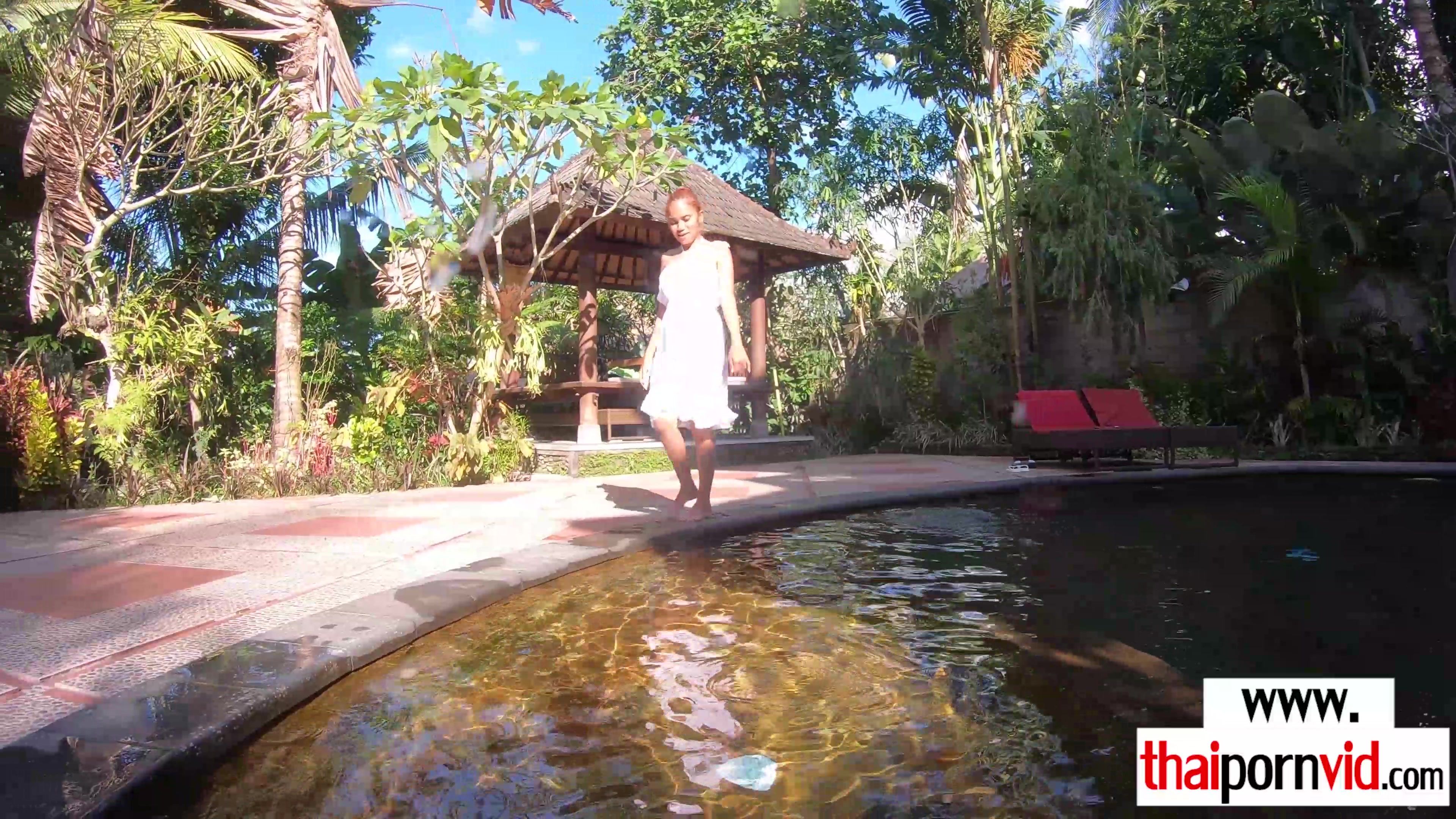 Petite amateur Thai teen Cherry with small tits drops off her clothes at her backyard outdoor and goes to the pool to cool down her hot body but her shaved pussy is still hot so she starts masturbating She is caressing her asian cunt under the water