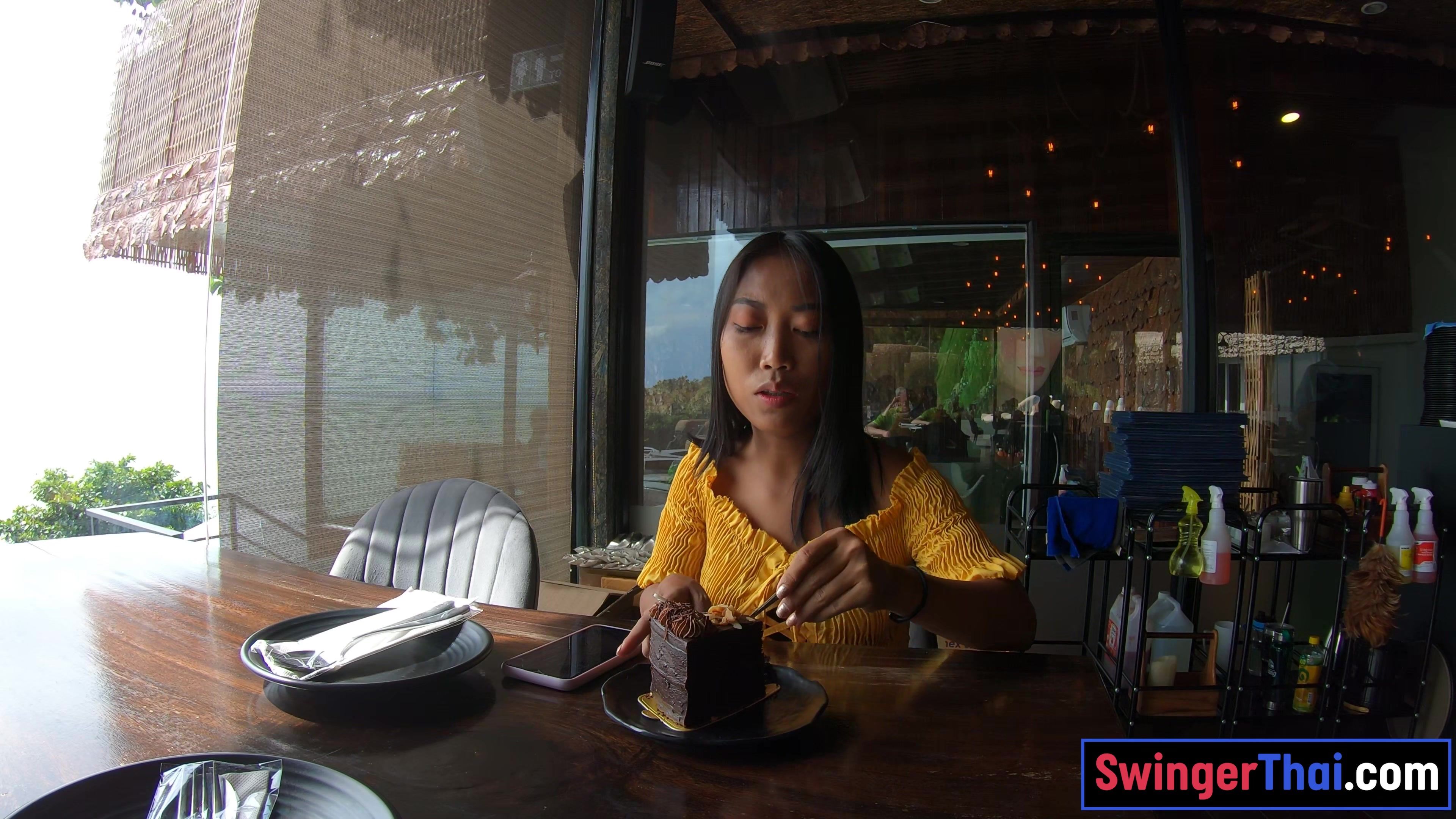 Cute Thai teen amateur GF eats chocolate cake and rides cock