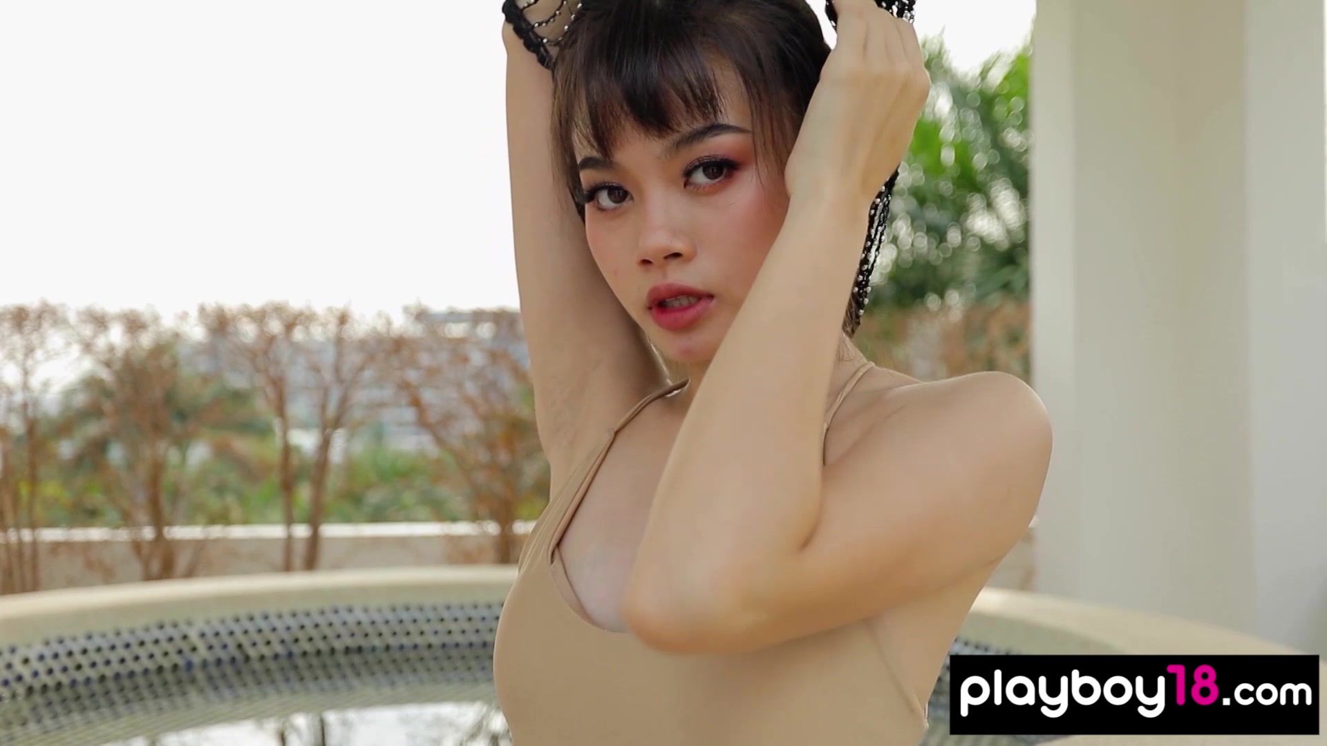 Cute faced amateur Thai teen with tiny boobs named Sowan goes to the roof where she drops off her sexy dress and the naked asian babe hops into a bath The smiling muse looks seductively and spreads her legs to show us her exotic pussy