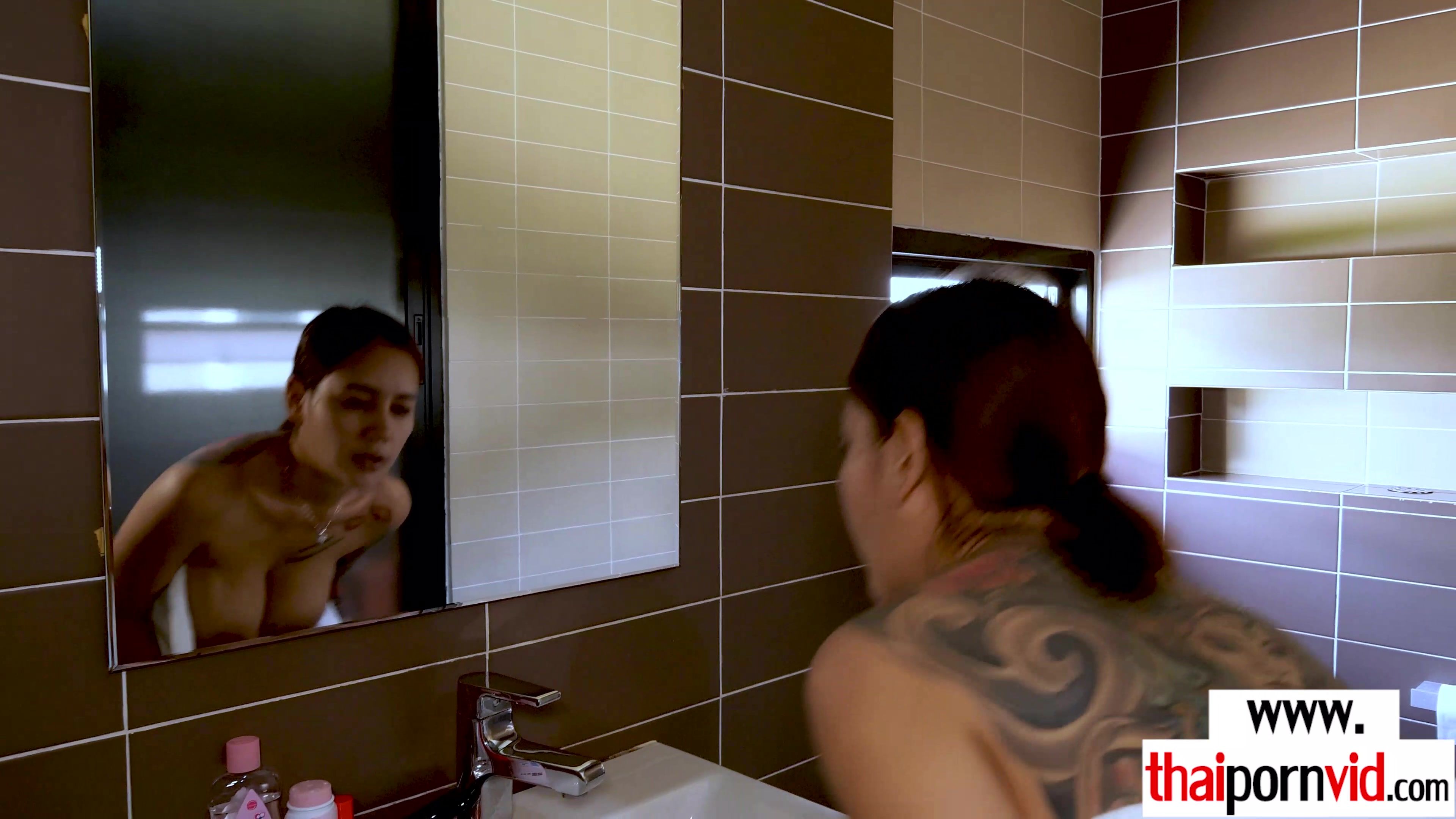 Amateur Thai MILF Noi with big hanging boobs is taking a shower to wash her exotic pussy for her next european client She takes on a sexy dress and grabs his big white cock The busty asian cougar gives a sensual blowjob then the guy is banging her