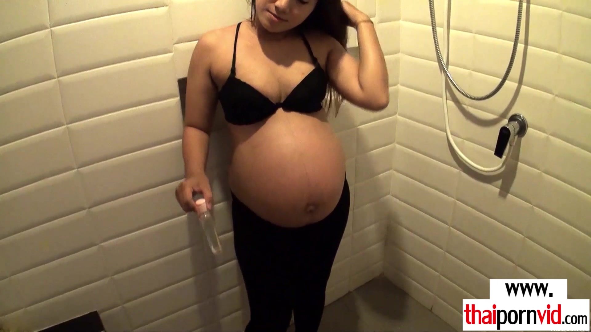 Hot amateur Thai pregnant Pat with big boobs is taking a shower and oiling her sexy body then she has to take care of her horny european lovers big white cock but her she doesnt want to fuck so she is giving him a sensual handjob