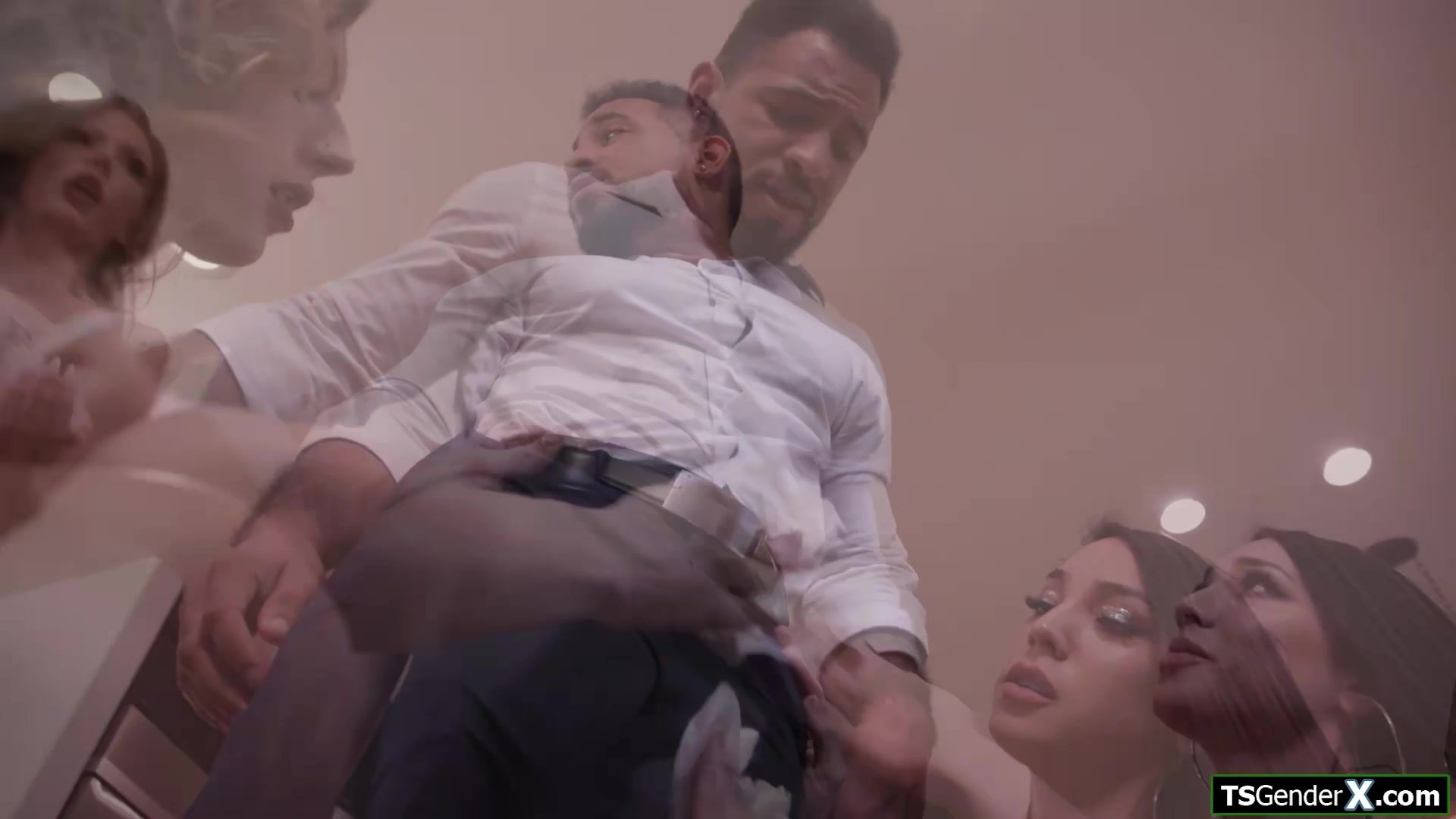 Shemales Jade Venus and Kasey Kei want to see her boss bbc and spill water over his pants.With his big black cock out the tgirls make their move.The busty trans and the asian tranny suck and get rimmed.The transsexuals do a triple bareback anal ride