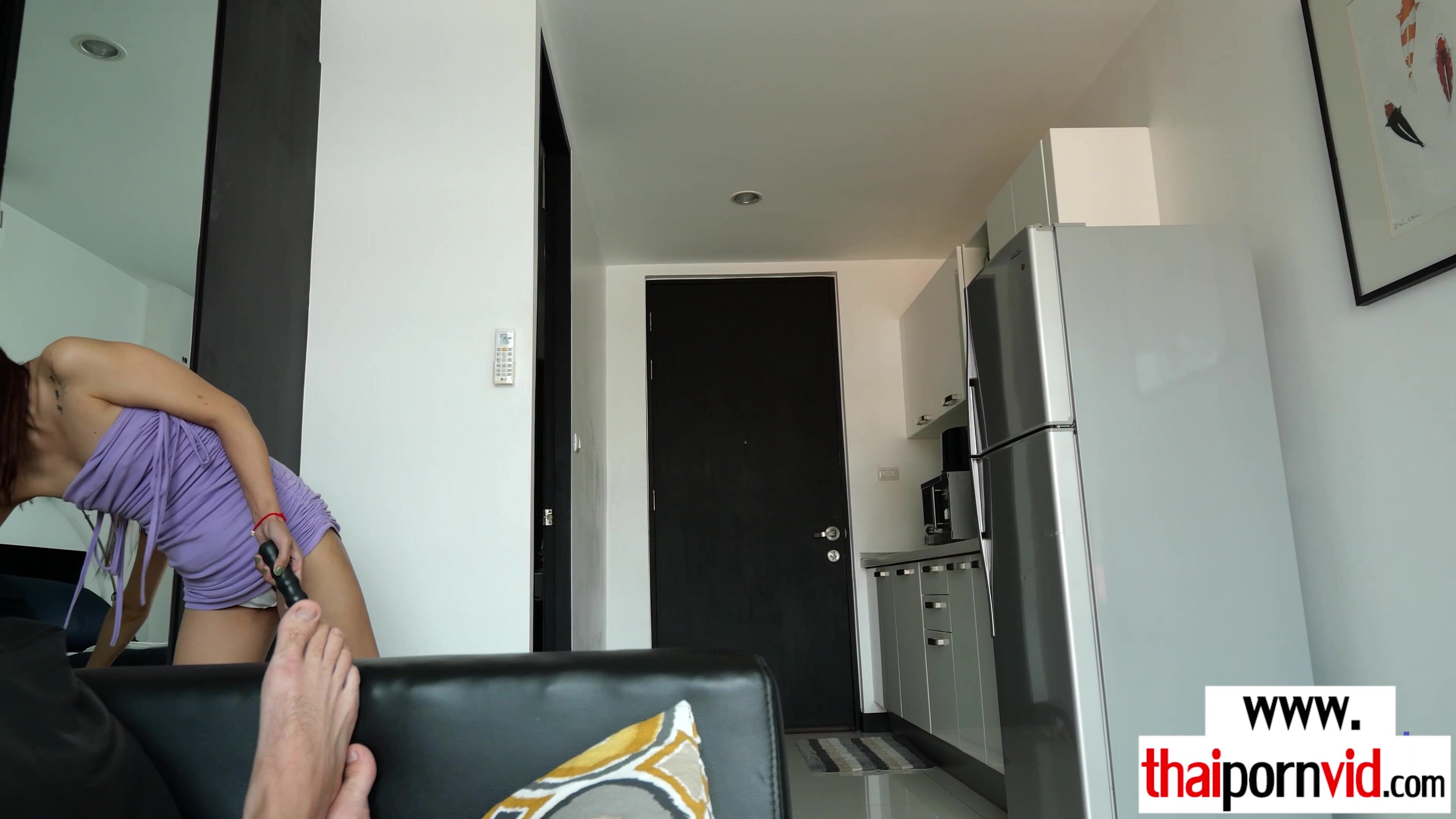 Skinny amateur Thai asian teen Nok with small tits is doing the chore wheen her horny european boyfriend orders her to wax his big white cock too The petite obedient slut gives him a nice blowjob and taking a ride on his throbbing dick