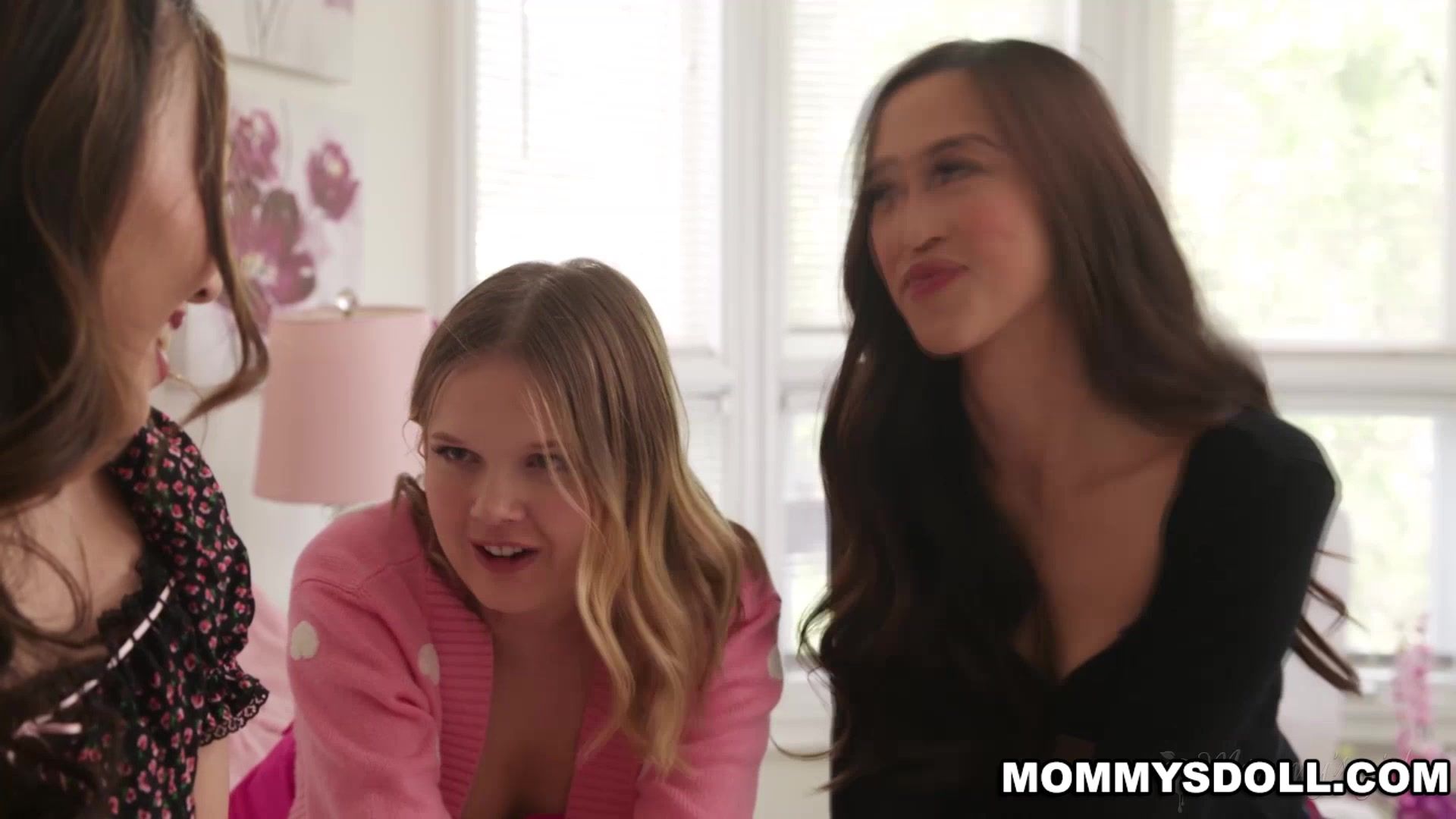Jessie barges into her stepdaughters room just as shes blasting her friends faces with squirt Shes super impressed with her stepdaughters talent and wants to see MORE A wild squirt foursome ensues where everyone gets a taste of Kimmys juices