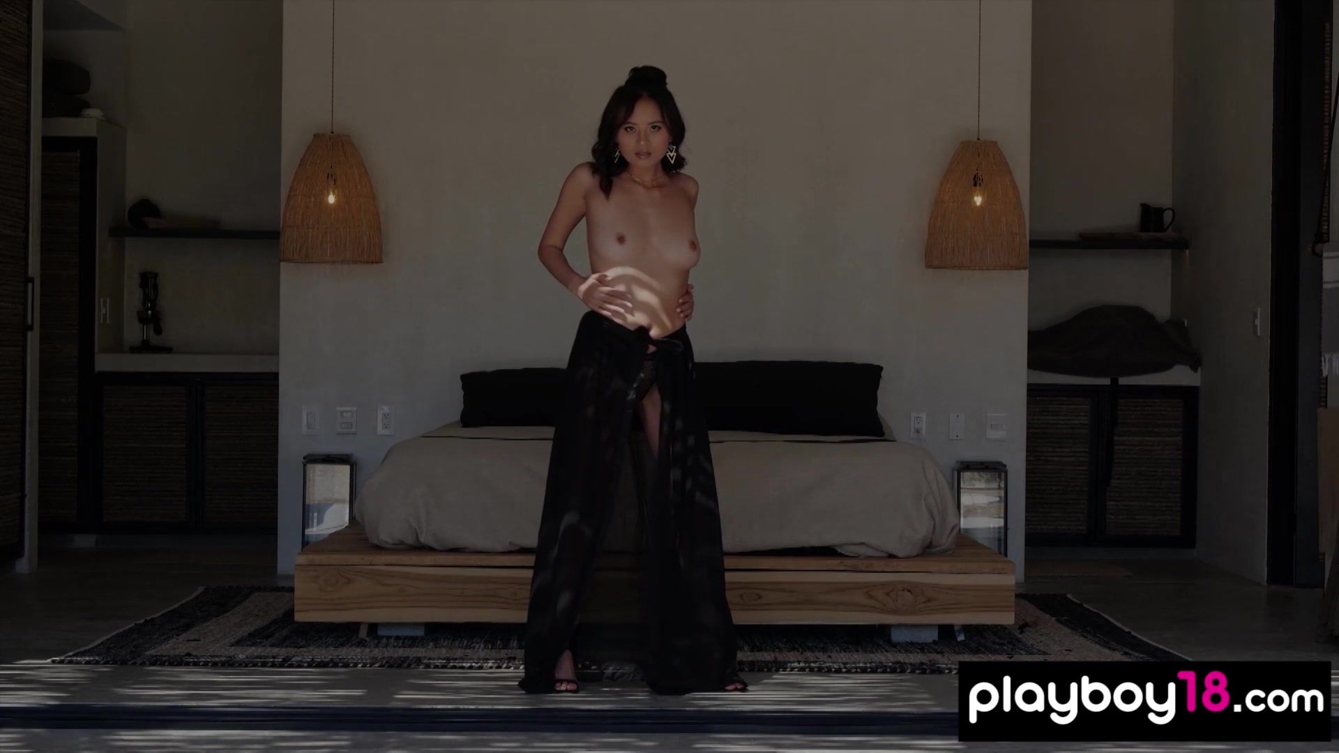 Shy newcomer asian teen KJ Carter with perfect natural tits is wating Playboy in a sexy black outfit to get some erotic photos about her amazing shapes She is stripping slowly then she spreads her legs to show us her exotic pussy