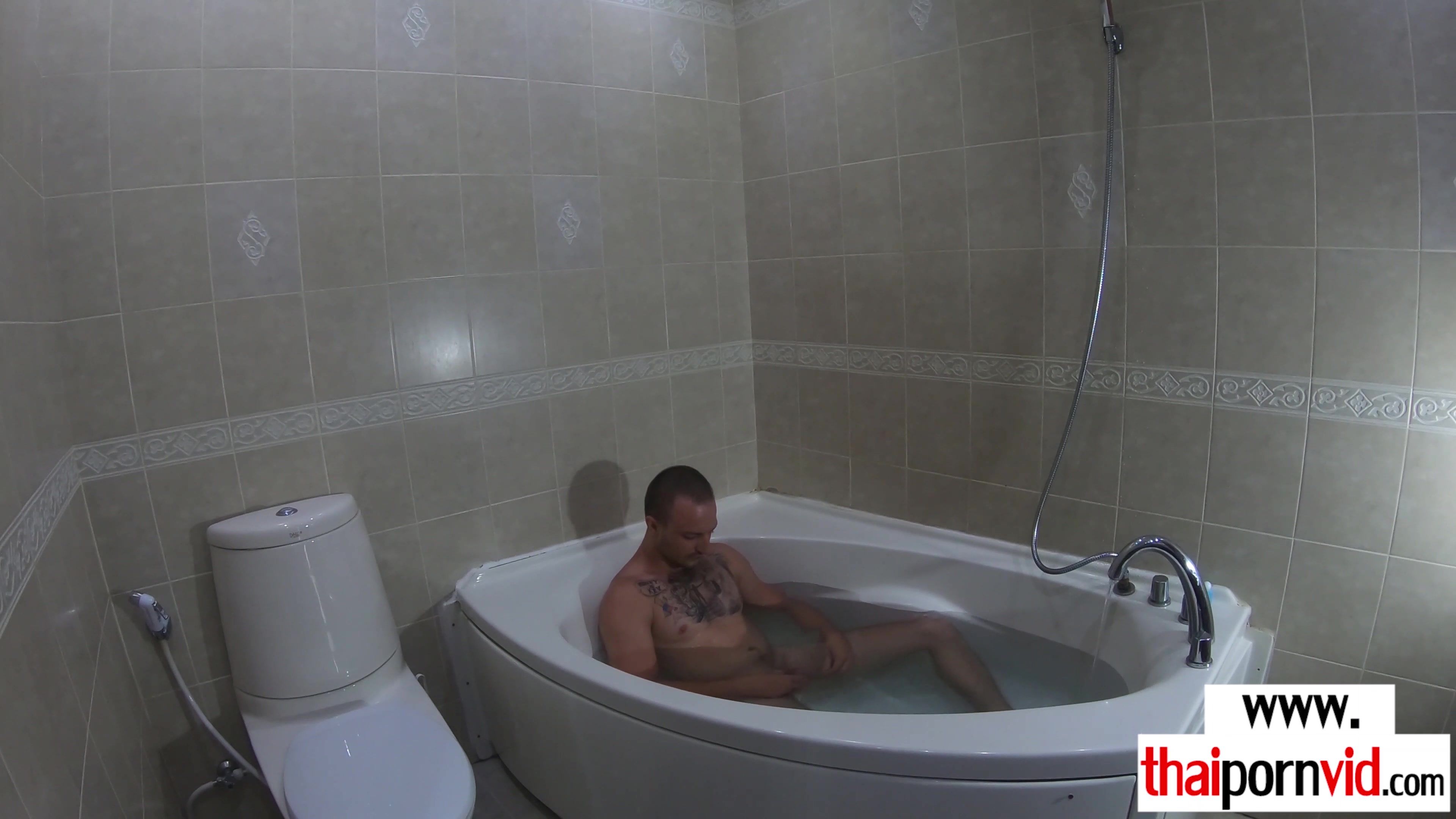 Dude is taking a bath and his petite amateur Thai teen GF Cherry with small tits joins to wax his big white cock She is giving a sensual blowjob then she bends over and asks him to fuck her exotic pussy from behind